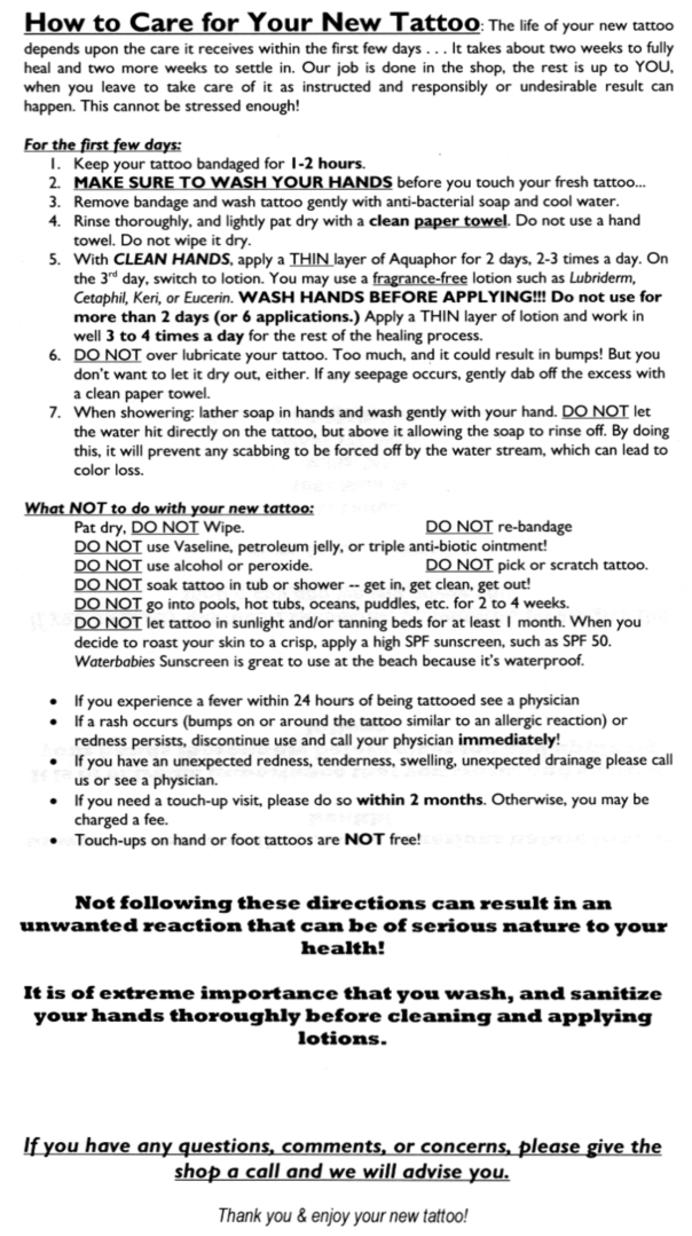 Tattoo Care Instructions : Tattoo Aftercare Tips And Instructions / This can take anywhere from 2 to 6 weeks, depending on the size and location of the tattoo.. Below are instructions on how to properly take care of your fresh tattoo. Avoid using any type of cloth to cleanse the tattoo because it will exfoliate the area—which, remember, is a wound. Apply antibiotic ointment or moisturizerto do this, make sure to remove the bandage that is covering the tattoo (the tattoo artist will wrap the tattoo after the session is completed), and wash the area with antibacterial soap and lukewarm water. After every wash, you should let your tattoo to dry completely after then you can use tattoo aftercare lotion. Be gentle, do not use a washcloth or anything that will exfoliate your tattoo.